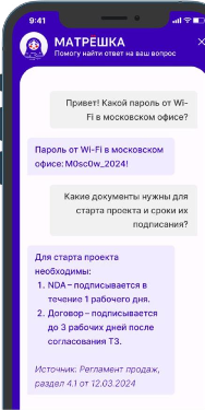 Цифровой помощник Матрёшка — это чат-бот и база знаний на основе искусственного интеллекта и нейросети, который обеспечивает сотруднику мгновенный доступ к информации компании 24/7, тем самым снижая нагрузку на повторяющиеся задачи и процессы, выполняемые HR-IT персоналом или другим операционным отделом